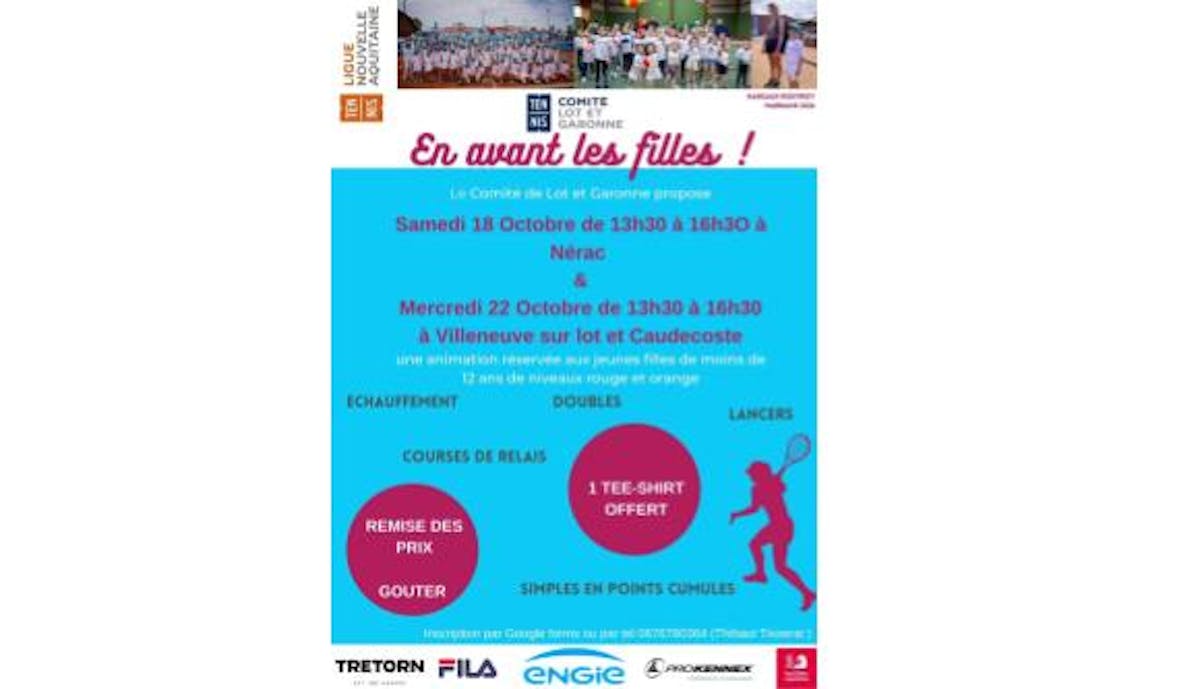 Le Comité Départemental de Tennis propose une ANIMATION GRATUITE, pour les jeunes filles ( licenciées et non licenciées ) de 7 à 12 ans, de niveaux Oranges ou Rouges, le Samedi 18 otobre 2025 et mercredi 22 octobre 2025 de 13h30 à 16h30 .